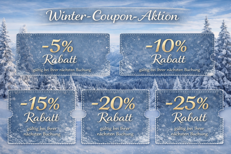 Die Coupon-Aktion läuft vom 04.01.2025 bis 22.02.2026. Diese Coupons können in unterschiedlichen Zimmerbuchungen verrechnet werden, die Coupons können pro Buchng nur einmal eingelösst werden. Von der Coupon-Aktion sind ausgenommen Monteurbuchungen sowie ein Buchung mit anderen Aktionen.